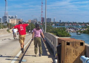 crossing bridges high over the ocean and rolling through dark neighborhoods